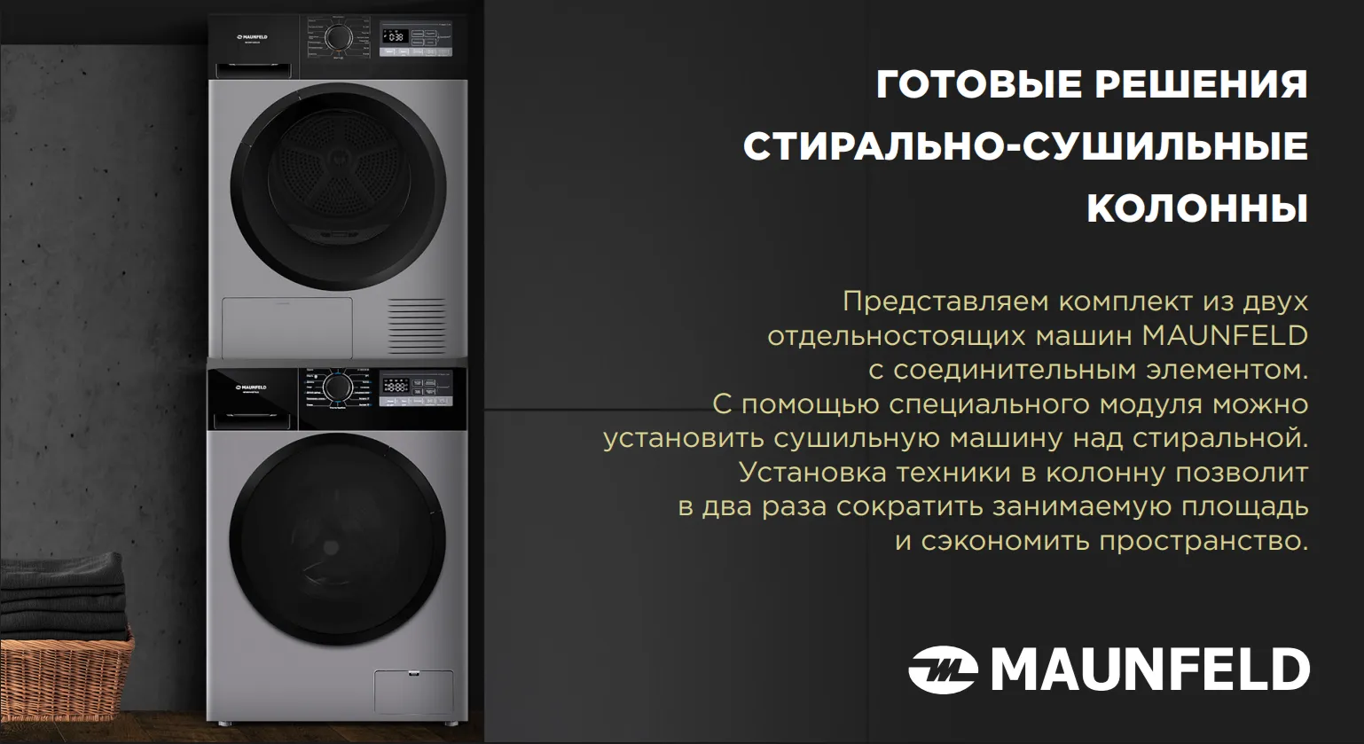 Maunfeld упрощает задачу выбора техники для дома. Теперь вы можете приобрести готовые комплекты, в которые входят идеально подобранные по характеристикам и дизайну стиральная и сушильная машины, а также необходимый соединительный элемент.