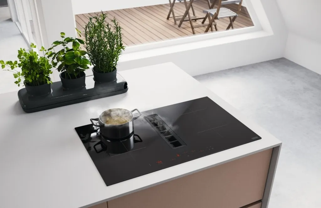 Эффективность. Благодаря расположению решетки в одной плоскости с конфорками (или между ними), воздух всасывается сразу, не успевая распространиться по комнате.