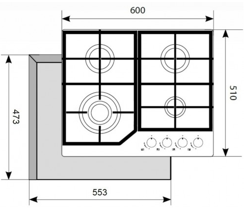 Расположение панели управления варочной поверхностью относительно конфорок. Если панель расположена сбоку, она будет справа.