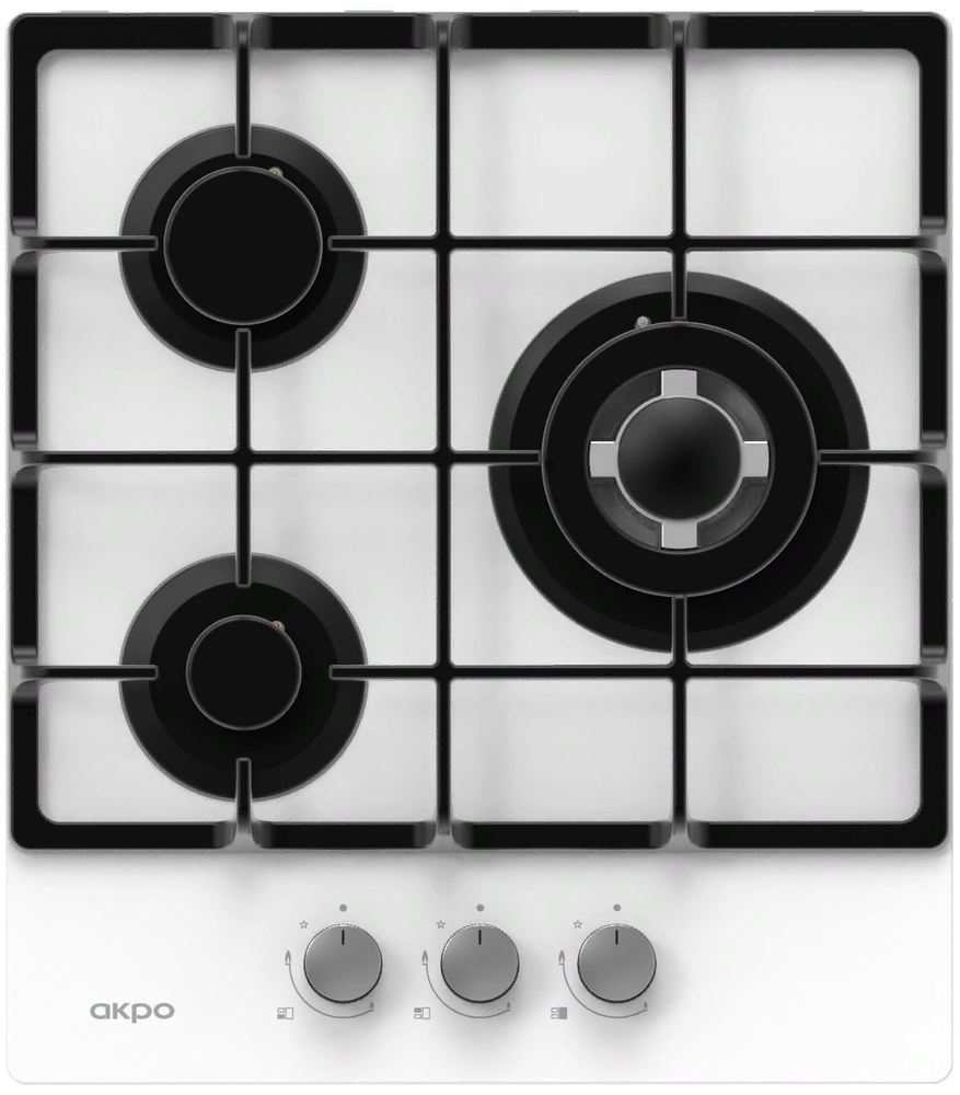 поверхность газовая, 45 см, газ на стекле, 3 конфорки, решетки чугунные, белый