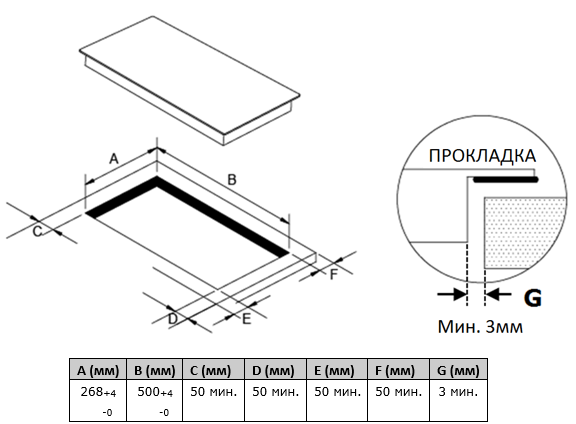 Характер огранки фаски на внешней стороне варочной панели. Металлические рамки предотвращают забивание монтажных швов крошками и пылью.