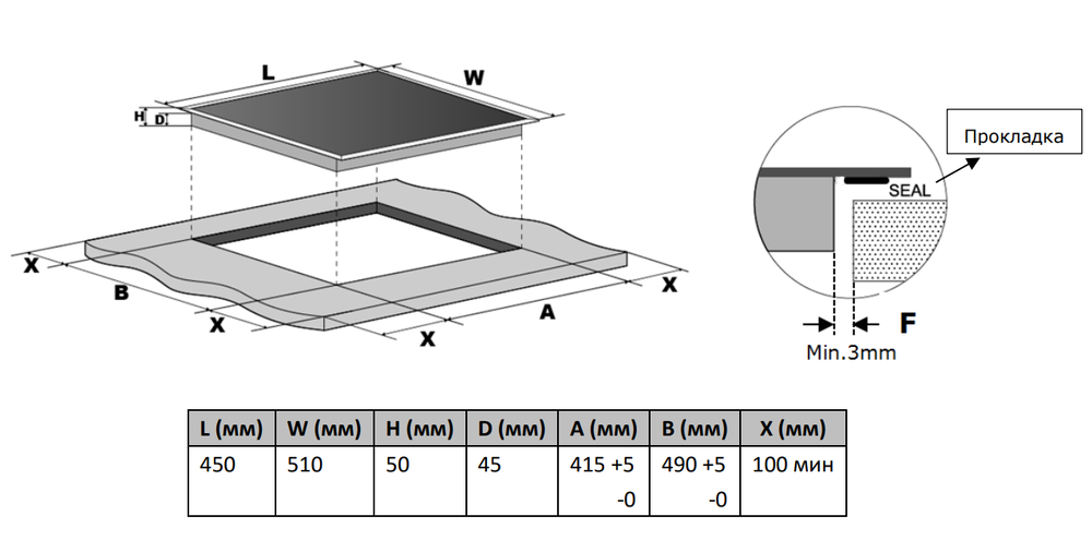 Характер огранки фаски на внешней стороне варочной панели. Металлические рамки предотвращают забивание монтажных швов крошками и пылью.