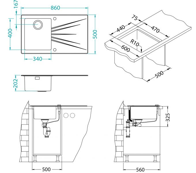мойка, нержавеющая сталь/стекло, 860х500 мм, черный