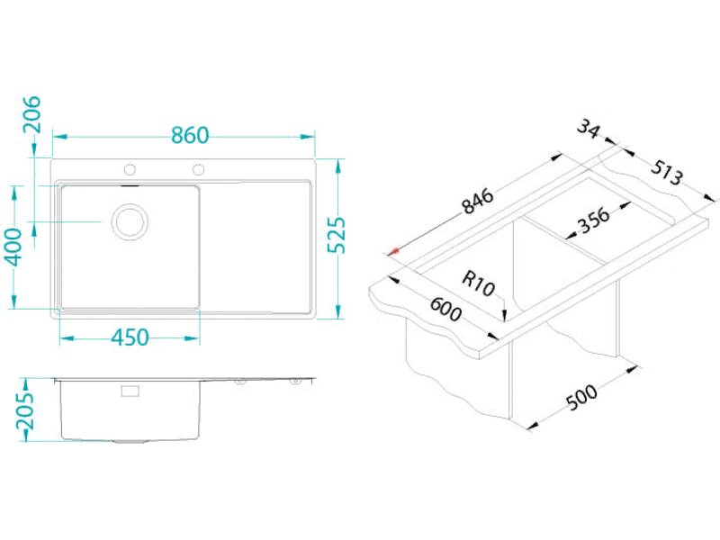 мойка, нержавеющая сталь, 860х525 мм, нержавеющая сталь
