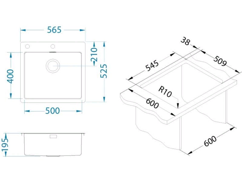 мойка, нержавеющая сталь, 565х525 мм, нержавеющая сталь