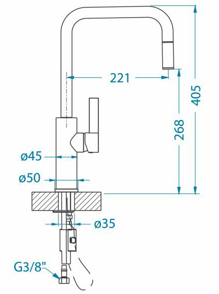 Встроенная в кран насадка на длинном гибком шланге с металлической оплеткой. Насадки с кнопкой могут переключать обычный излив воды на душ.