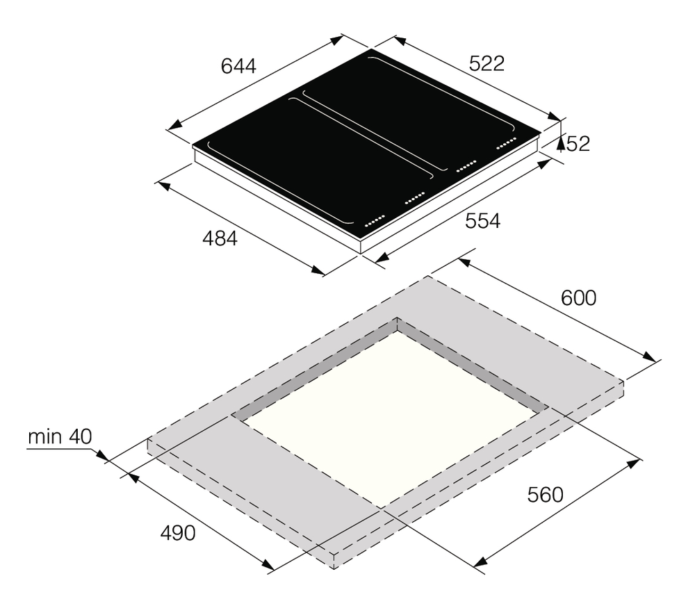 Характер огранки фаски на внешней стороне варочной панели. Металлические рамки предотвращают забивание монтажных швов крошками и пылью.