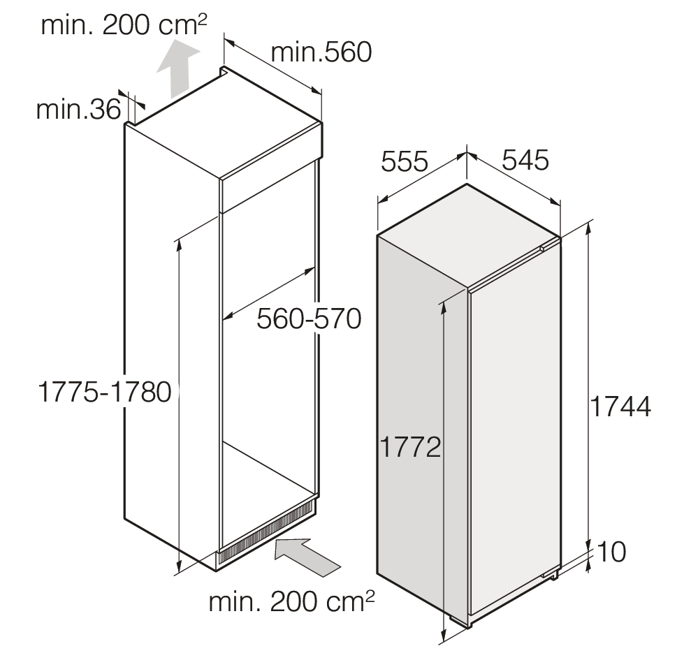 холодильник однокамерный встраиваемый, 301 л, класс энергопотребления А++, система размораживания ручная, 55,5x54,5x177,2 см