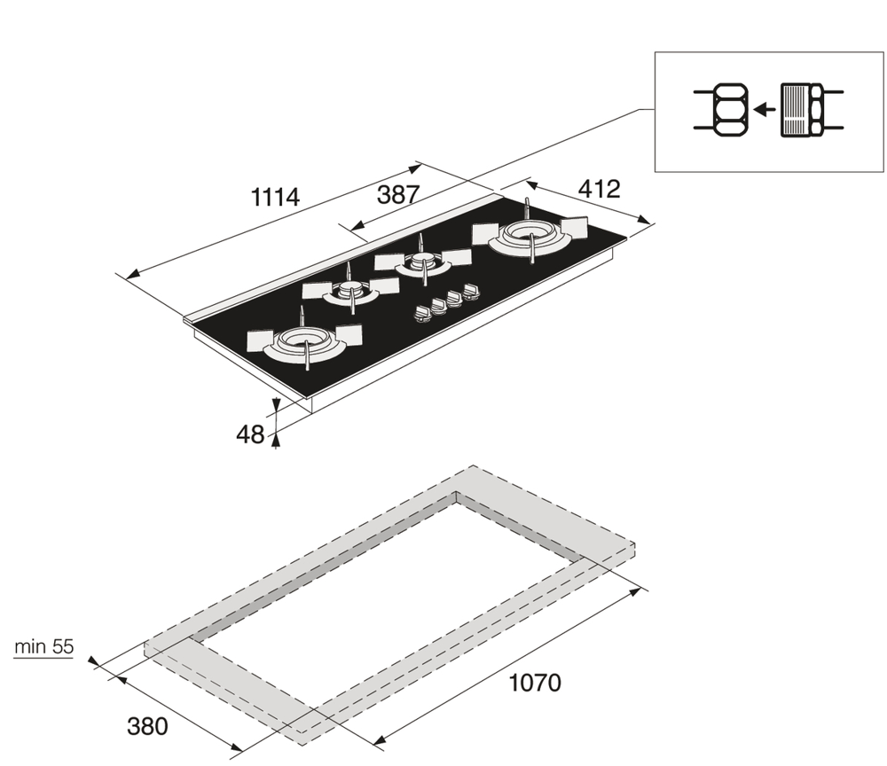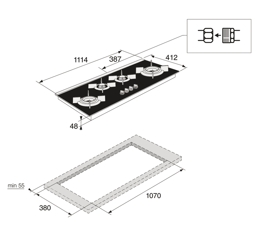 поверхность газовая, 111 см, газ на стекле, 4 конфорки, чугунные решетки, черный