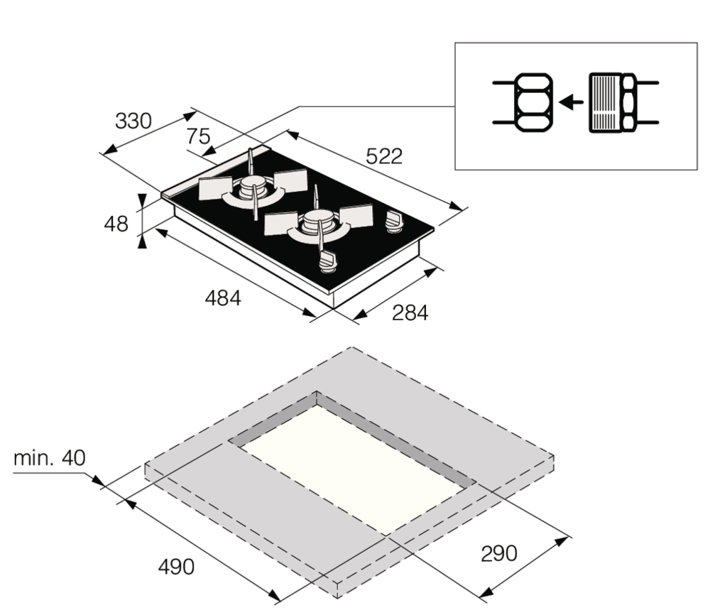 поверхность газовая, 33 см, газ на стекле, 2 конфорки, чугунные решетки, черный