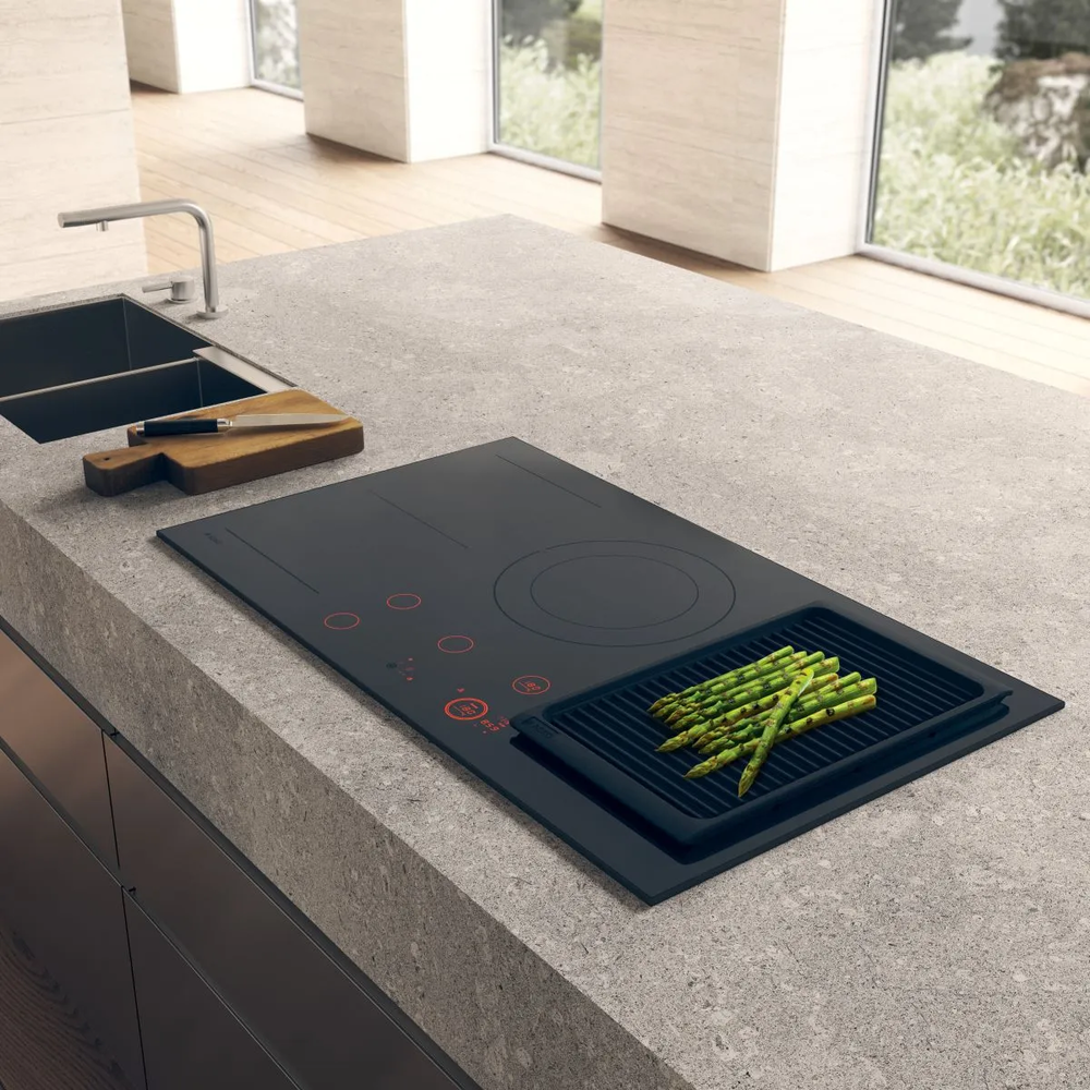 Модели со встроенной вытяжкой подходят для компактных кухонь. Запахи, пар и дым от готовки полностью поглощаются встроенной вытяжкой.