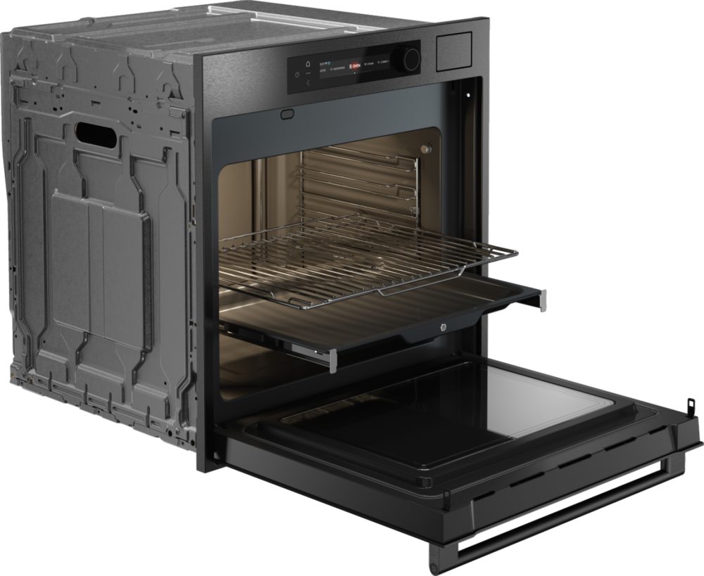 - Полностью выдвижные телескопические направляющие — безопасная и комфортная работа с тяжелыми противнями и формами для выпечки
