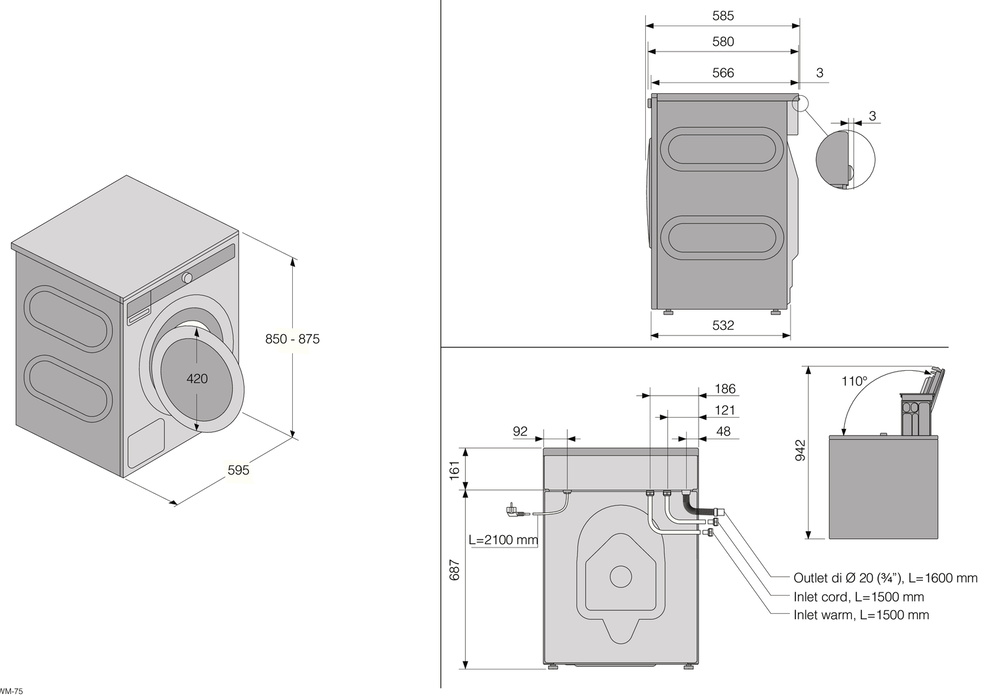 машина стиральная с фронтальной загрузкой отдельностоящая, 1800 об/мин, 9 кг, 59,5х58,5х85 см, белый