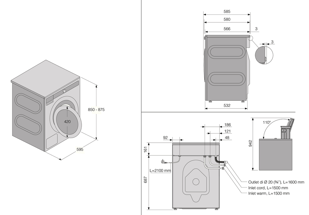 машина стиральная с фронтальной загрузкой отдельностоящая, 1800 об/мин, 9 кг, 59,5х58,5х85 см, белый