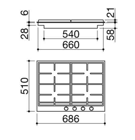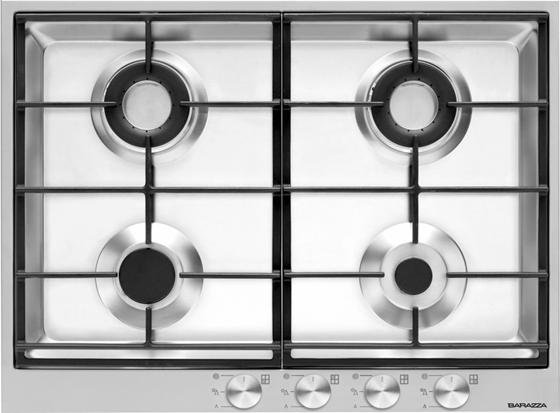 поверхность газовая, 70 см, газ на металле, 4 конфорки, решетки чугунные, нержавеющая сталь