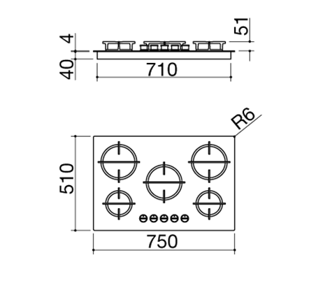 поверхность газовая, 75 см, газ на металле, 5 конфорок, решетки чугунные, нержавеющая сталь