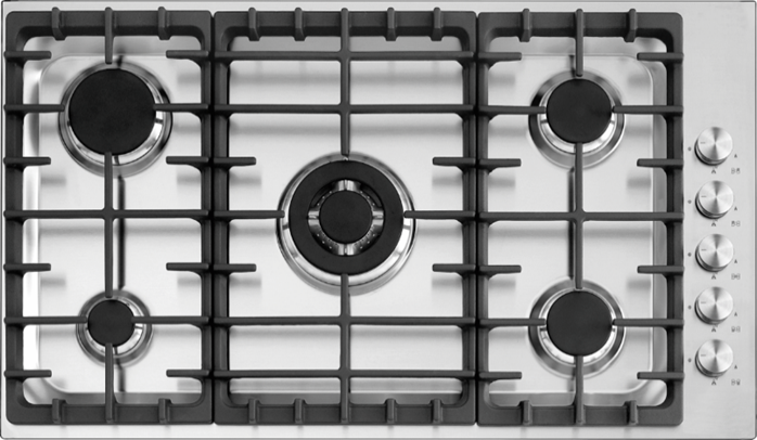 поверхность газовая, 87 см, газ на металле, 5 конфорок, решетки чугунные, нержавеющая сталь