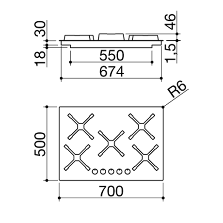 поверхность газовая, 70 см, газ на металле, 5 конфорок, решетки чугунные, нержавеющая сталь