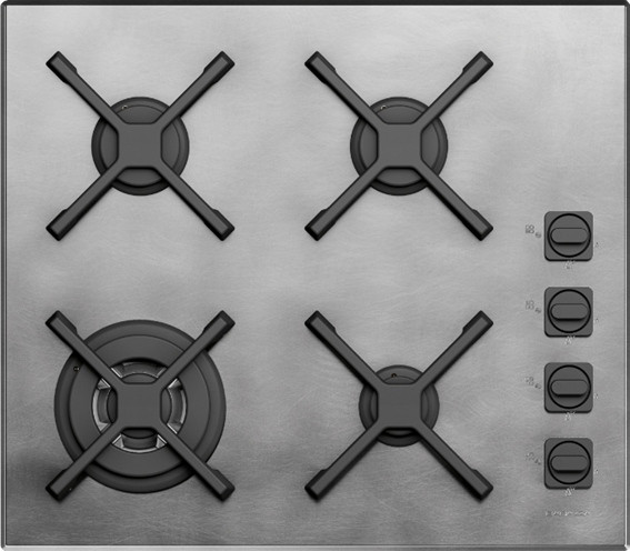 поверхность газовая, 60 см, газ на металле, 4 конфорки, решетки чугунные, нержавеющая сталь
