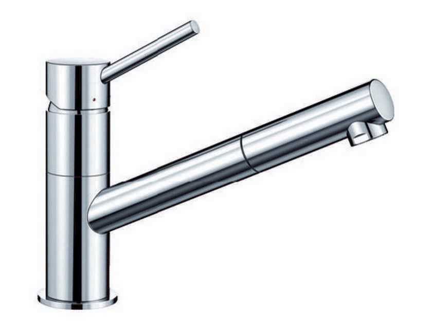 Встроенная в кран насадка на длинном гибком шланге с металлической оплеткой. Насадки с кнопкой могут переключать обычный излив воды на душ.