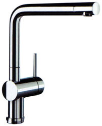 Встроенная в кран насадка на длинном гибком шланге с металлической оплеткой. Насадки с кнопкой могут переключать обычный излив воды на душ.