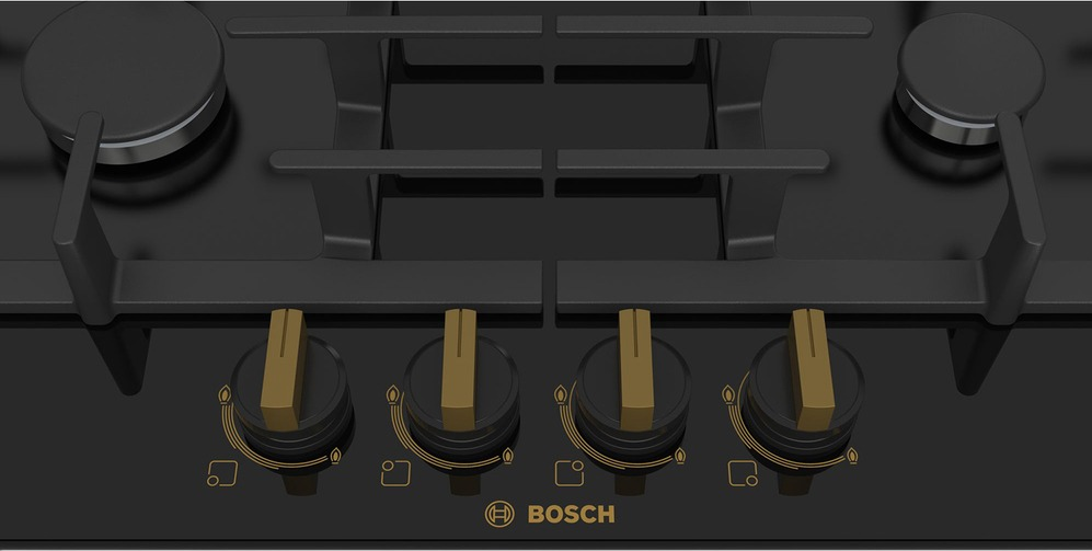 поверхность газовая, 60 см, газ на стекле, 4 конфорки, решетки чугунные, черный