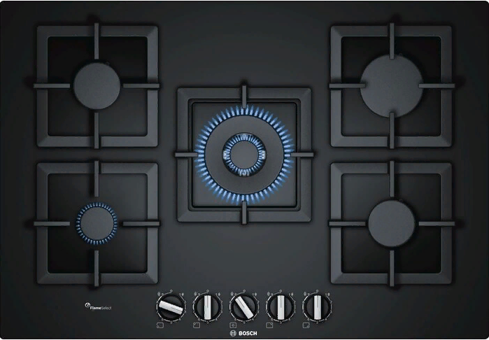 поверхность газовая, 75 см, газ на стекле, 5 конфорок, решетки чугунные, черный