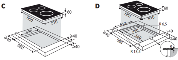 Характер огранки фаски на внешней стороне варочной панели. Металлические рамки предотвращают забивание монтажных швов крошками и пылью.