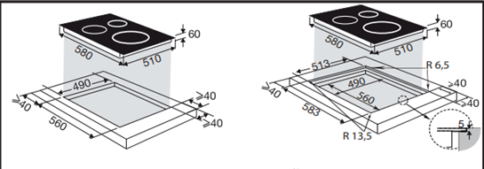 Характер огранки фаски на внешней стороне варочной панели. Металлические рамки предотвращают забивание монтажных швов крошками и пылью.