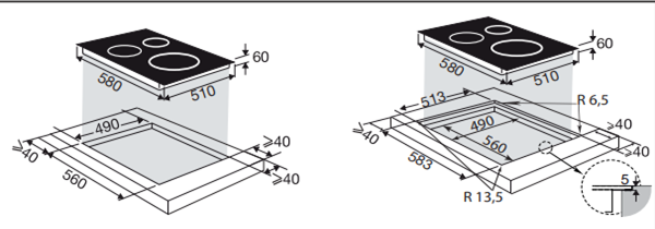 Характер огранки фаски на внешней стороне варочной панели. Металлические рамки предотвращают забивание монтажных швов крошками и пылью.