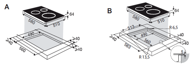 Характер огранки фаски на внешней стороне варочной панели. Металлические рамки предотвращают забивание монтажных швов крошками и пылью.
