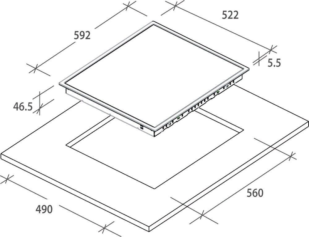 Характер огранки фаски на внешней стороне варочной панели. Металлические рамки предотвращают забивание монтажных швов крошками и пылью.