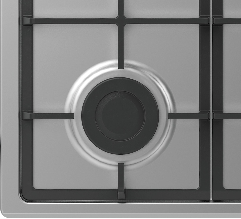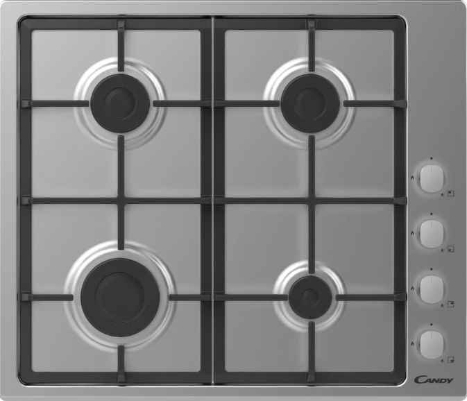 поверхность газовая, 60 см, газ на металле, 4 конфорки, чугунные решетки, нержавеющая сталь