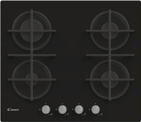 поверхность газовая, 60 см, газ на стекле, 4 конфорки, решетки чугунные, черный