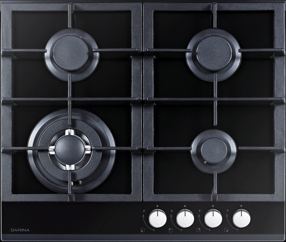 поверхность газовая, 60 см, газ на стекле, 4 конфорки, решетки чугунные, черный