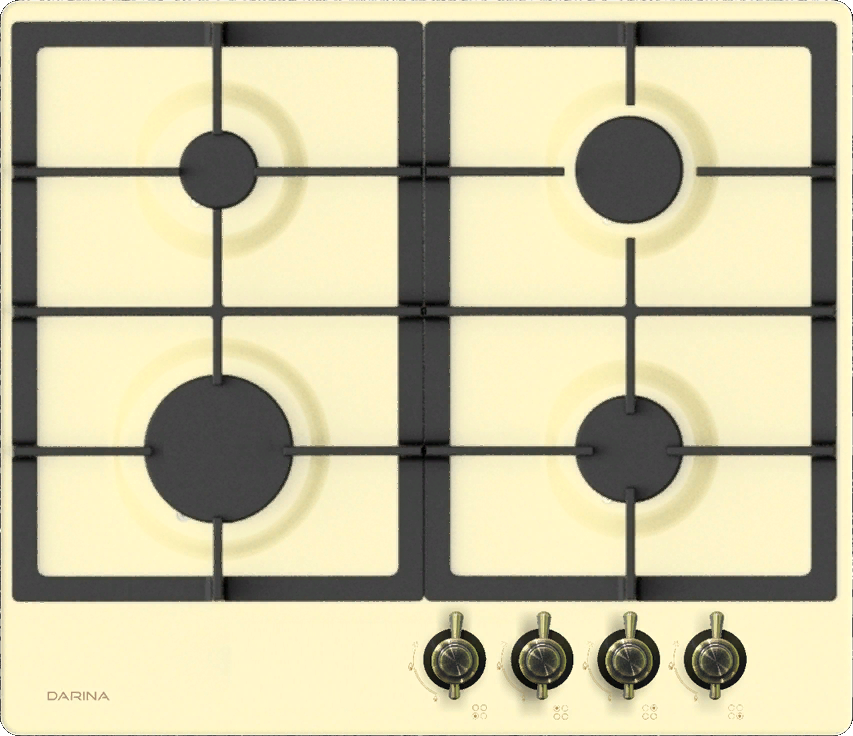 поверхность газовая, 60 см, газ на эмали, 4 конфорки, решетки чугунные, бежевый