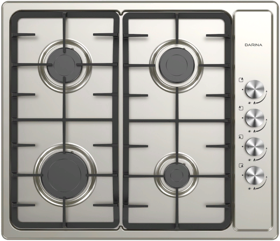 поверхность газовая, 60 см, газ на металле, 4 конфорки, решетки эмалированные, нержавеющая сталь