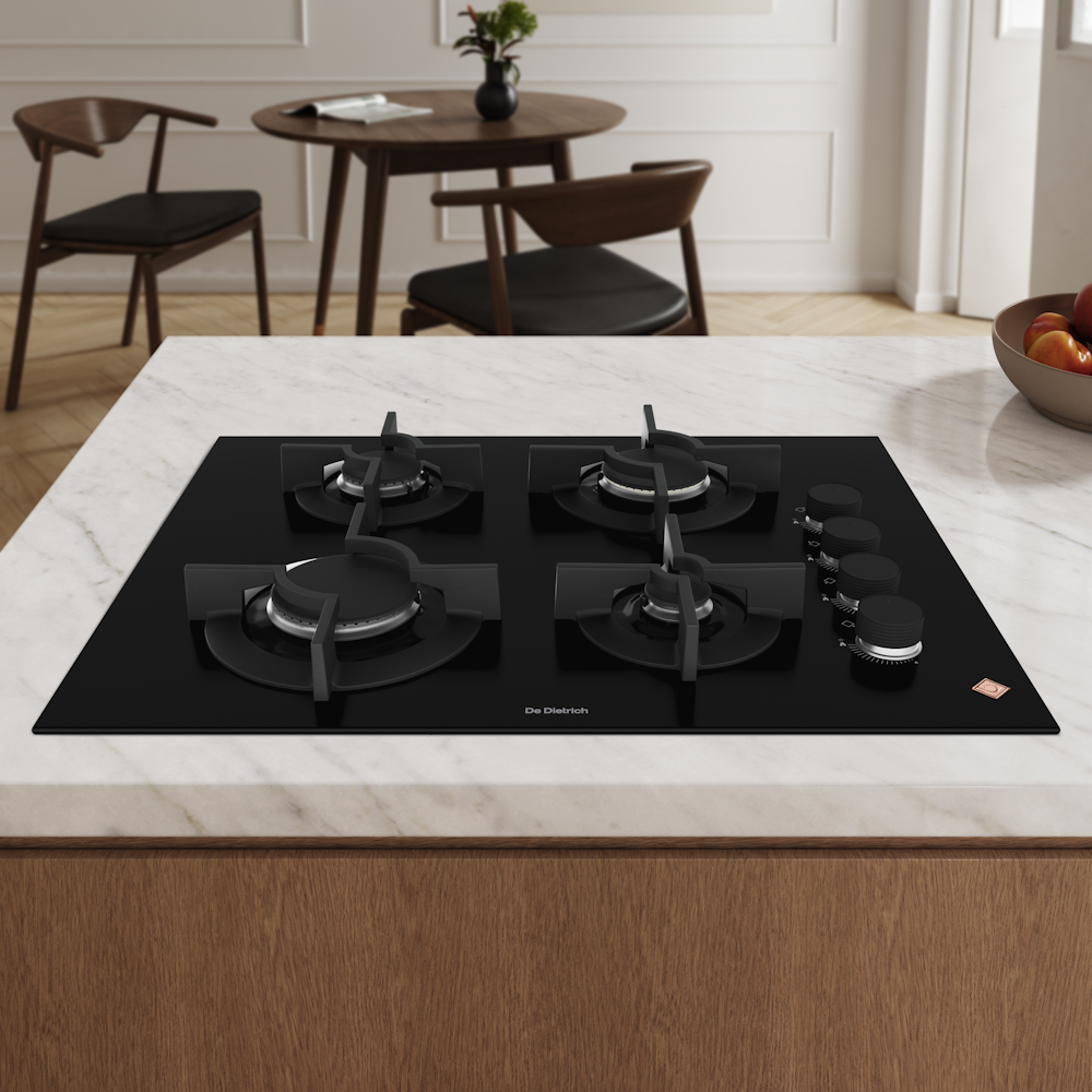 поверхность газовая, 65 см, газ на стекле, 4 конфорки, решетки чугунные, черный