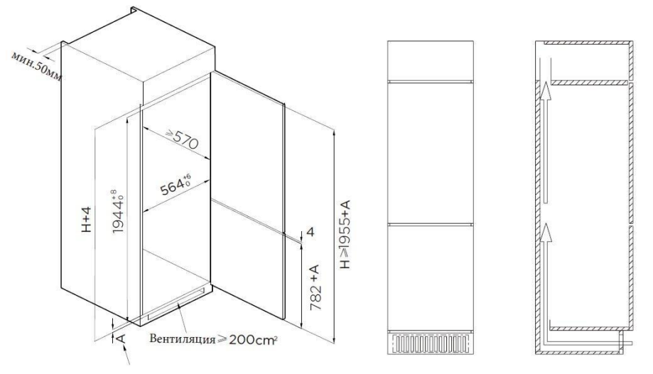 холодильник-морозильник встраиваемый, 307 л, класс энергопотребления А++, No Frost, 54х55х195,5 см