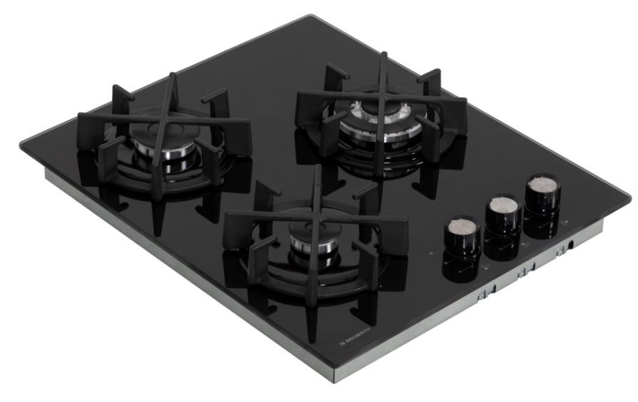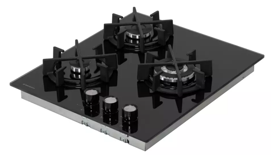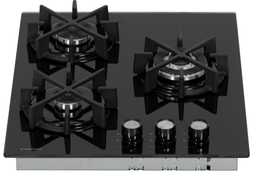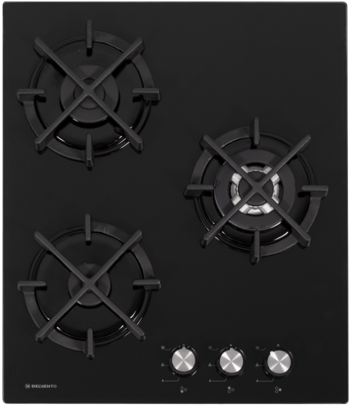 поверхность газовая, 45 см, газ на стекле, 3 конфорки, решетки чугунные, черный