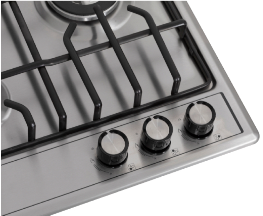 поверхность газовая, 45 см, газ на металле, 3 конфорки, решетки чугунные, нержавеющая сталь
