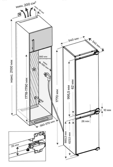 холодильник-морозильник встраиваемый, 251 л, класс энергопотребления А+, капельная система, 54,5x54x177 см, белый