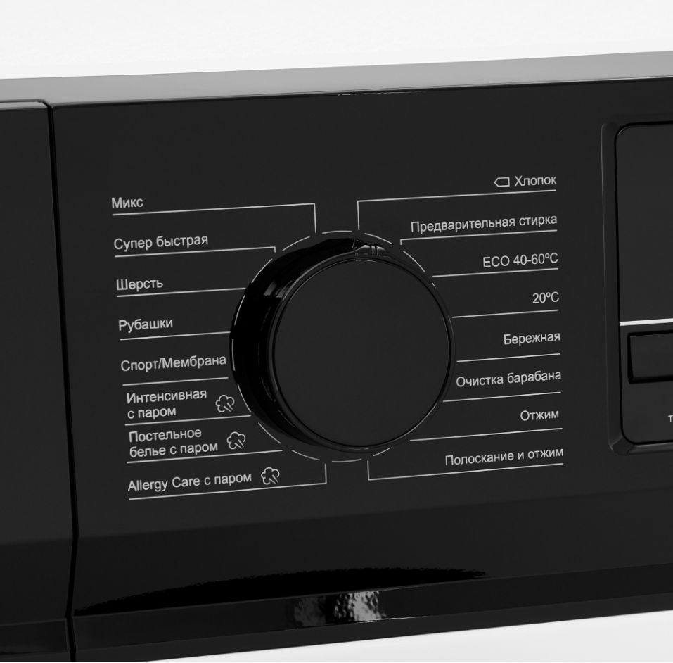 Функция подачи пара из парогенератора в барабан позволит разгладить вещи после стирки, обработать их от бактерий, вирусов и аллергенов.