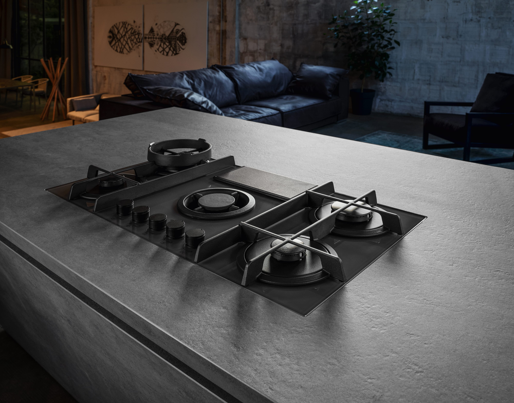 поверхность газовая с встроенной вытяжкой, 88 см, газ на стекле, 5 конфорок, решетки чугунные, черный