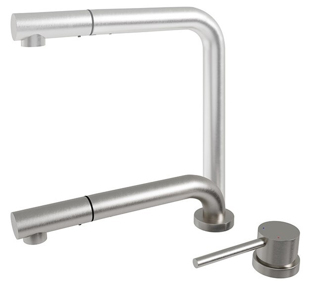 Встроенная в кран насадка на длинном гибком шланге с металлической оплеткой. Насадки с кнопкой могут переключать обычный излив воды на душ.