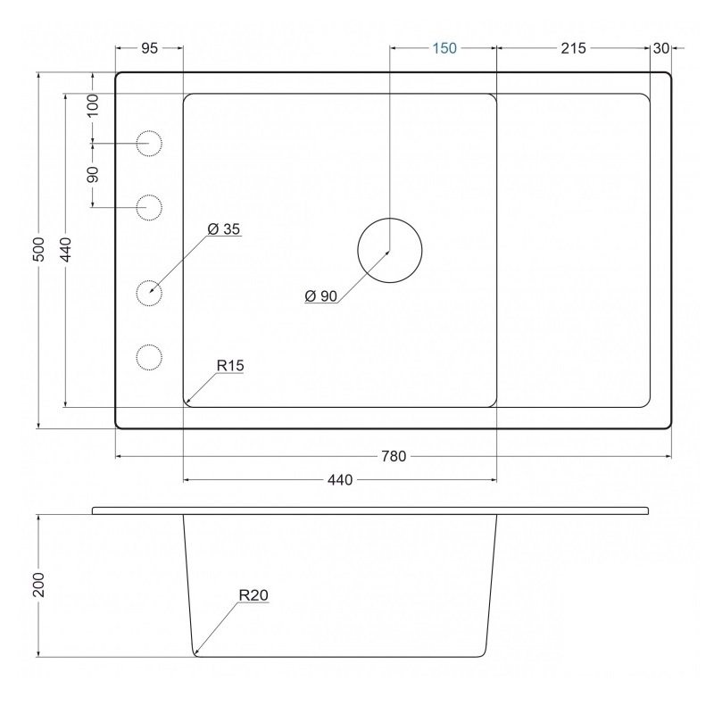Расстояние от дна до верхней кромки чаши мойки. Оптимальная глубина — 15-18 см. Чем глубже мойка, тем меньше брызг попадет наружу.