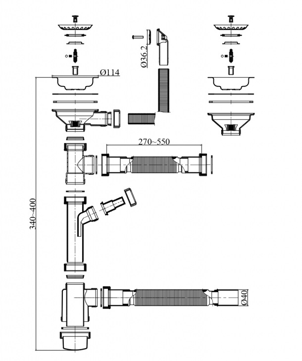 Emar ESQ-2P, сифон двухчашевой мойки с переливом