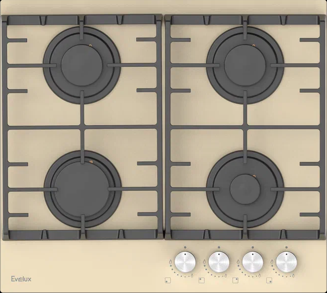 поверхность газовая, 60 см, газ на стекле, 4 конфорки, решетки чугунные, бежевый