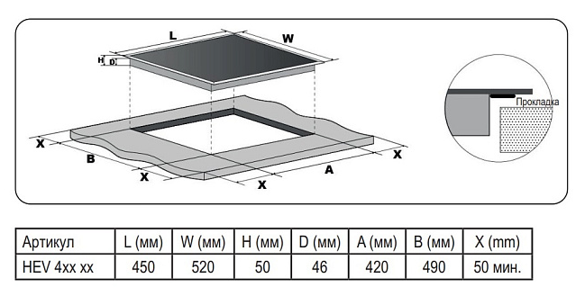 Характер огранки фаски на внешней стороне варочной панели. Металлические рамки предотвращают забивание монтажных швов крошками и пылью.