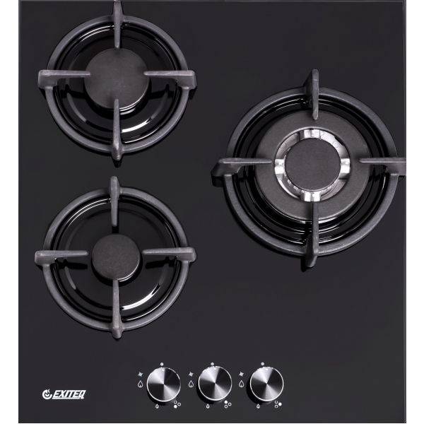 поверхность газовая, 45 см, газ на стекле, 3 конфорки, решетки чугунные, черный